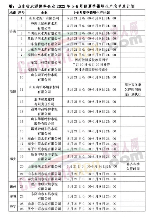 山東省水泥熟料企業(yè)2022年5-6月份夏季錯峰生產(chǎn)名單及計劃中列出72家水泥企業(yè)。其中7家企業(yè)需補(bǔ)齊冬季欠停時間,4家企業(yè)處于技改停窯或全年停窯中,費費縣沂州水泥有限公司2#線計劃于6月1日0:00-6月20日24:00期間停窯。