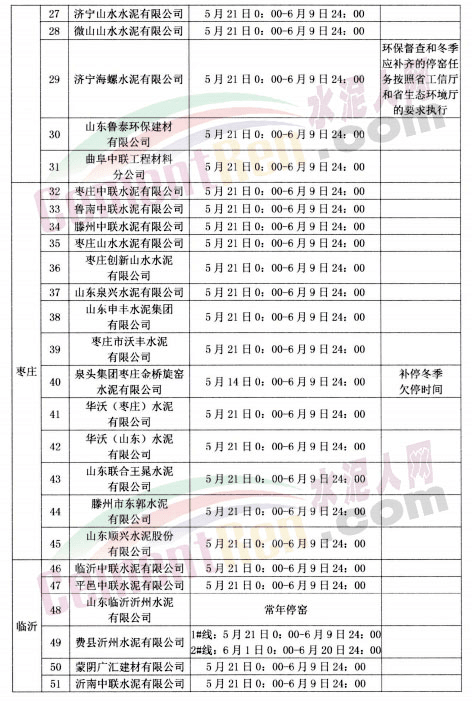 3 山東臨沂沂州水泥有限公司常年停窯;