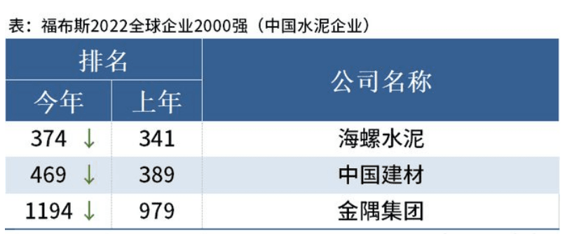 5月12日晚,福布斯2022全球企業2000強發布,其中以水泥為主營業務的企業中,海螺水泥、中國建材、金隅股份分別名列第374位、469位、1194位。三家企業較上年位次均有下滑。海螺水泥價341位下滑至374位。金隅集團跌出1000位之外。
