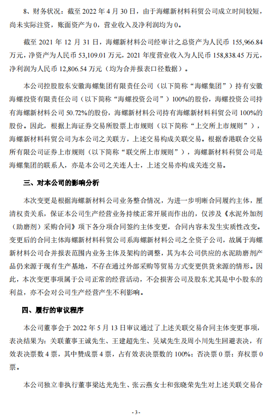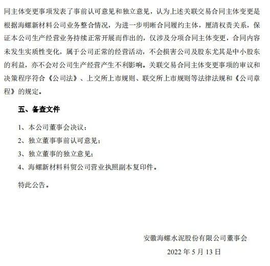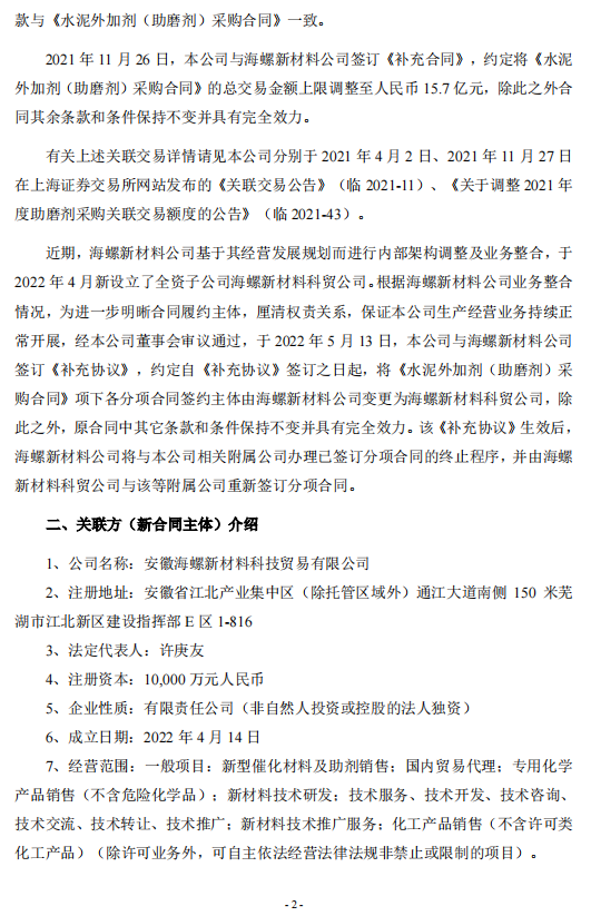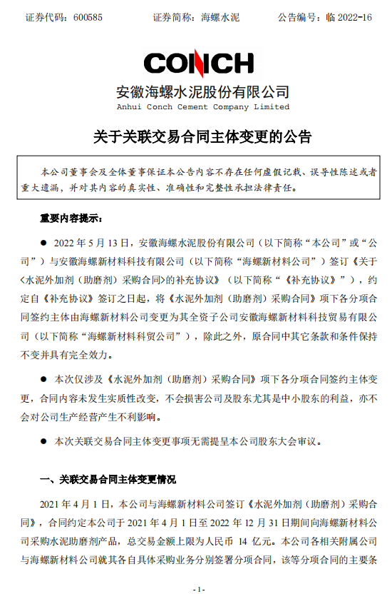 日前,海螺水泥發(fā)布《關(guān)于關(guān)聯(lián)交易合同主體變更的公告》稱(chēng),2022年5月13日,安徽海螺水泥股份有限公司與安徽海螺新材料科技有限公司簽訂《關(guān)于<水泥外加劑(助磨劑)采購(gòu)合同>的補(bǔ)充協(xié)議》,約定自《補(bǔ)充協(xié)議》簽訂之日起,將《水泥外加劑(助磨劑)采購(gòu)合同》項(xiàng)下各分項(xiàng)合同簽約主體由海螺新材料公司變更為其全資子公司安徽海螺新材料科技貿(mào)易有限公司,除此之外,原合同中其它條款和條件保持不變并具有完全效力。