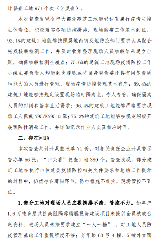 本次督查共計(jì)開具整改單71份,對(duì)相關(guān)責(zé)任企業(yè)開具警示督辦單56張,“回頭看”復(fù)查工地380個(gè)。督查發(fā)現(xiàn),部分建筑工地在執(zhí)行市住建委疫情防控相關(guān)文件要求和總站工作提示的過程中,仍然存在薄弱環(huán)節(jié),防控措施不扎實(shí),現(xiàn)場管控不到位。