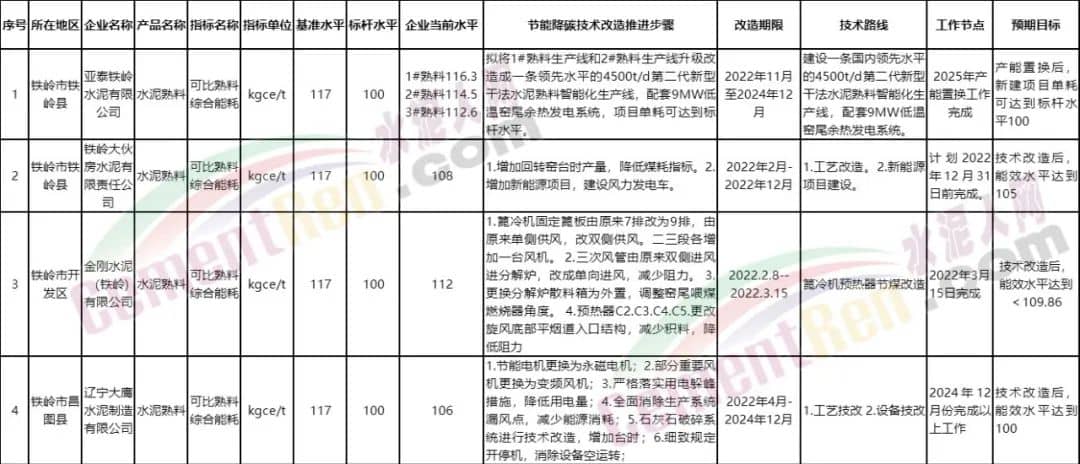鐵嶺大伙房水泥有限責任公司增加回轉窯臺時產量等降低煤耗指標工藝改造項目和建設風力發電車等新能源項目,到2022年末實現企業能耗達到105千克標準/噸。