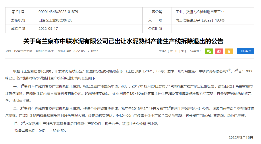 5月16日,內蒙古自治區工信廳發布《關于烏蘭察布中聯水泥有限公司已出讓水泥熟料產能生產線拆除退出的公告》稱,烏蘭察布中聯水泥有限公司1#、2#日產2000噸已出讓產能指標的水泥熟料生產已不再具備重啟且恢復生產的條件。
