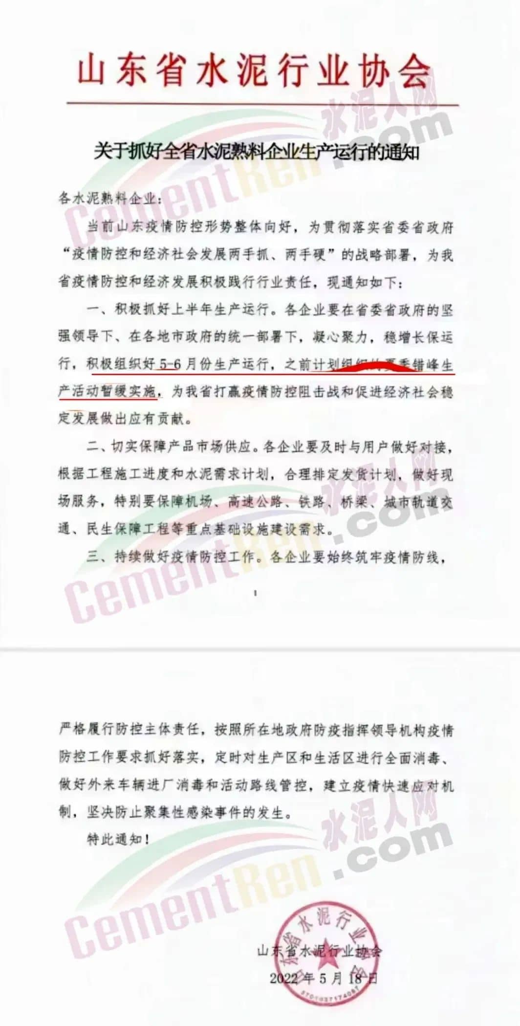 5月18日,山東省水泥行業(yè)協(xié)會發(fā)布《關(guān)于抓好全省水泥熟料企業(yè)生產(chǎn)運行的通知》稱, 為積極抓好上半年生產(chǎn)運行。各企業(yè)要在省委省政府的堅強領(lǐng)導(dǎo)下、在各地市政府的統(tǒng)一部署下,凝心聚力,穩(wěn)增長保運行,積極組織好5-6月份生產(chǎn)運行,之前計劃組織的夏季錯峰生產(chǎn)活動暫緩實施,為山東省打贏疫情防控阻擊戰(zhàn)和促進經(jīng)濟社會穩(wěn)定發(fā)展做出應(yīng)有貢獻。