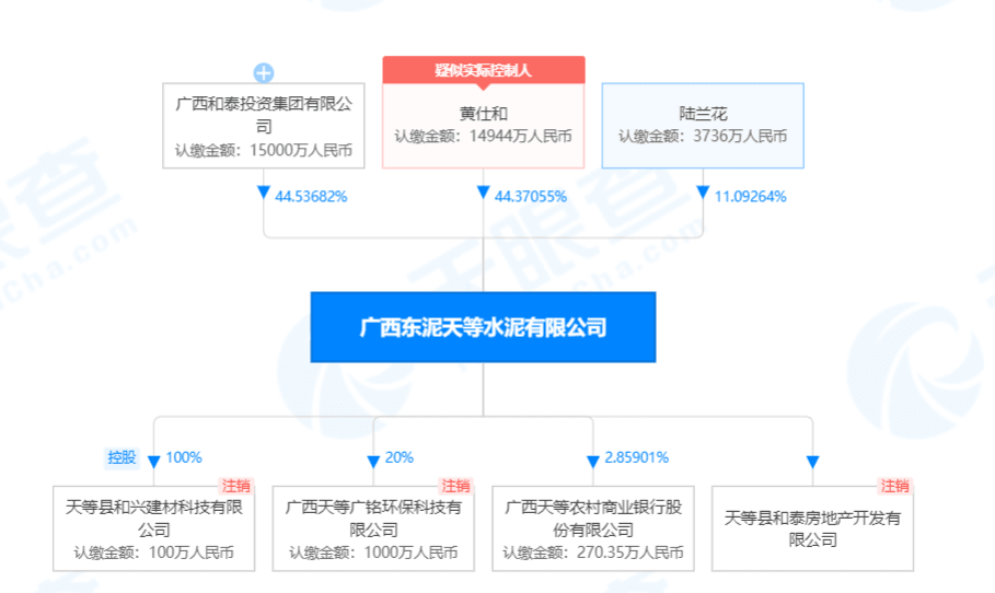 天眼查信息顯示,廣西東泥天等水泥有限公司由廣西和泰置業(yè)投資集團(tuán)有限公司控股,其法定代表人為黃仕和,企業(yè)注冊(cè)資本為33680萬(wàn)元。