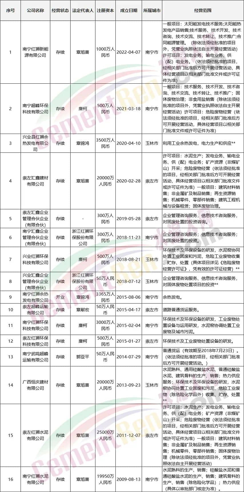 天眼查數(shù)據(jù)顯示,紅獅水泥在廣西壯族自治區(qū)內(nèi)至少擁有16家注冊(cè)公司。