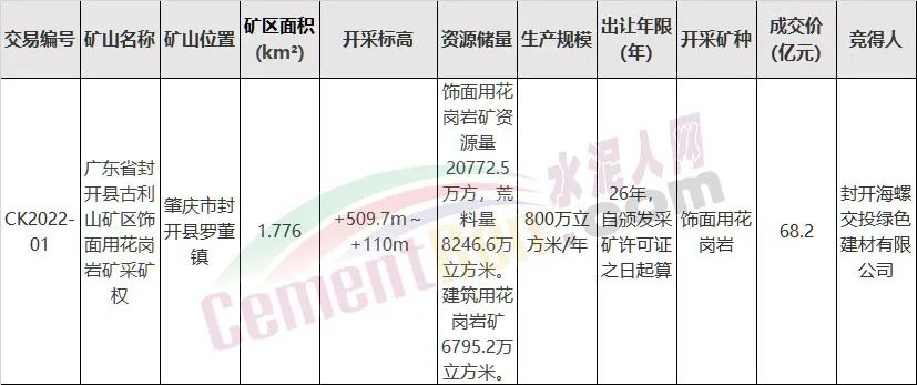 從2020年底,經過307輪舉牌79次加價,海螺水泥以18.28億高價競得叉河水泥廠及礦權、土地、商標等資產,溢價率105.83%。到如今又以68.2億元成功奪下封開縣古利山礦區飾面用花崗巖礦采礦權。