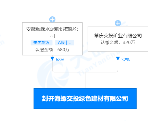 企業股權穿透圖可見,封開海螺交投綠色建材有限公司由安徽海螺水泥有限公司和肇慶交投礦業有限公司合股經營,其中海螺水泥占股68%為控股大股東。
