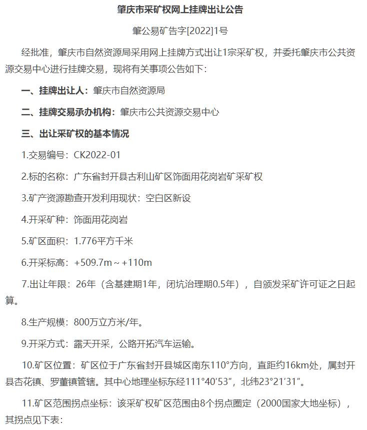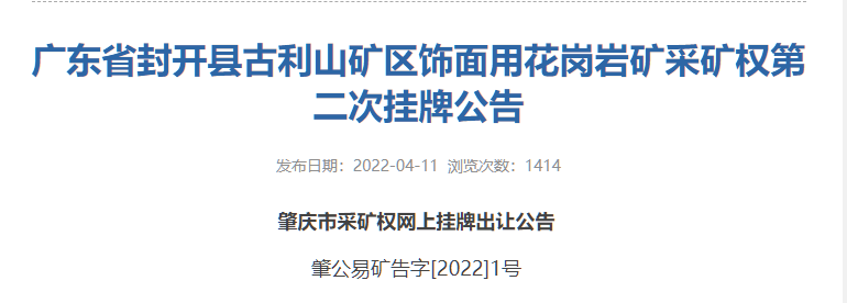 據悉,去年11月,該礦權由于涉及礦業權糾紛,不能及時解決,掛牌交易終止。今年4月11日,在肇慶市自然資源局網上進行二次掛牌交易。