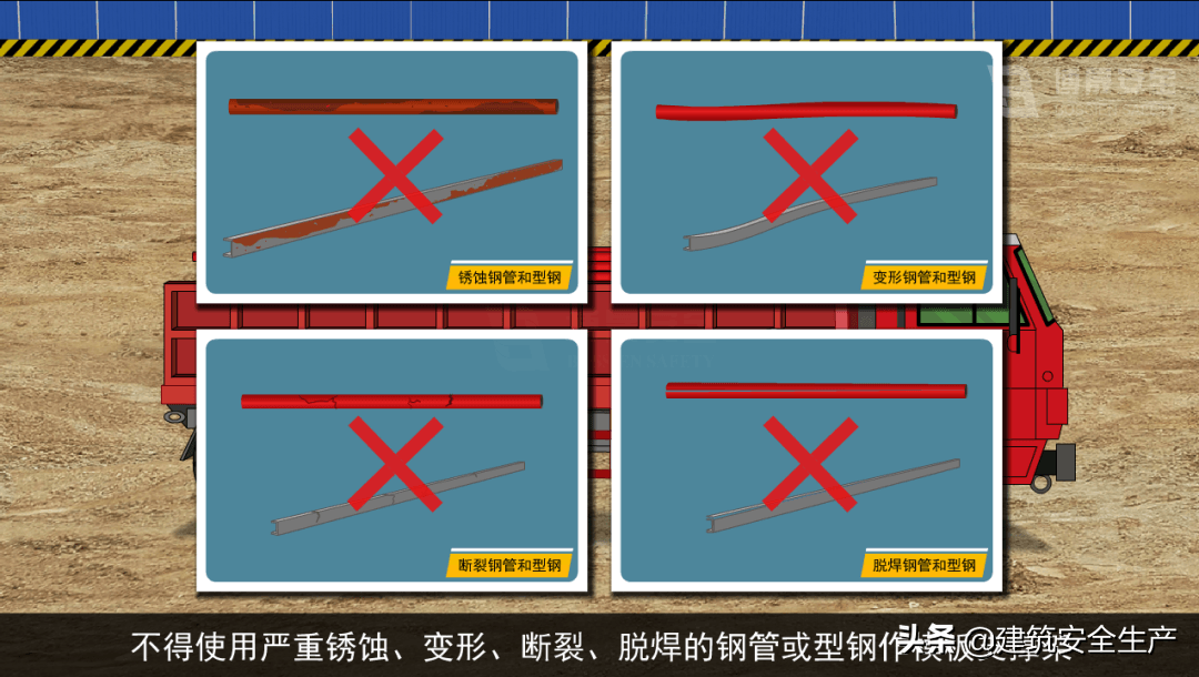 2.模板支撐架構(gòu)配件進(jìn)場應(yīng)進(jìn)行驗(yàn)收,構(gòu)配件及材質(zhì)應(yīng)符合專項(xiàng)施工方案及相關(guān)標(biāo)準(zhǔn)的規(guī)定。不得使用嚴(yán)重銹蝕、變形、斷裂、脫焊的鋼管或型鋼做模板支撐架。嚴(yán)禁使用竹、木材和剛才混搭的結(jié)構(gòu)。所采用的構(gòu)件應(yīng)進(jìn)行復(fù)試。