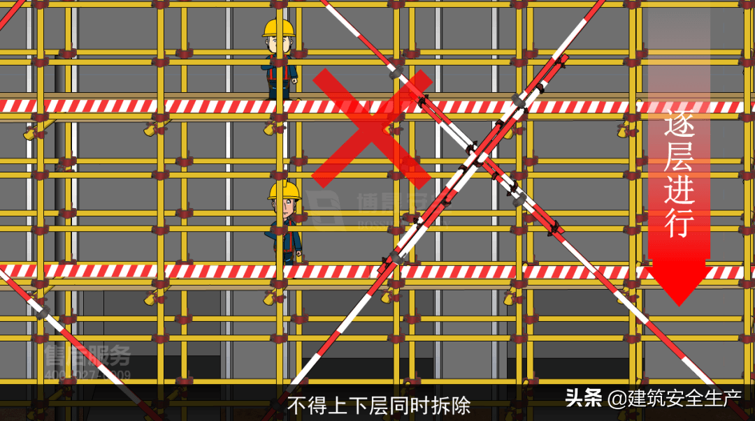1)架體拆除應(yīng)自上而下逐層進(jìn)行,不得上下層同時進(jìn)行。