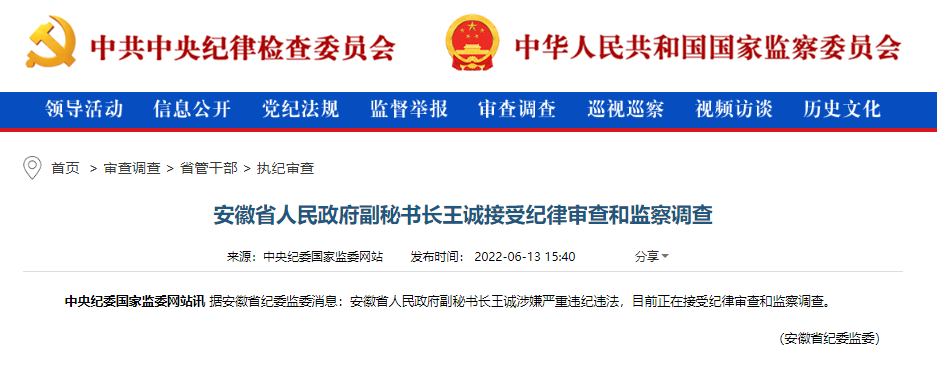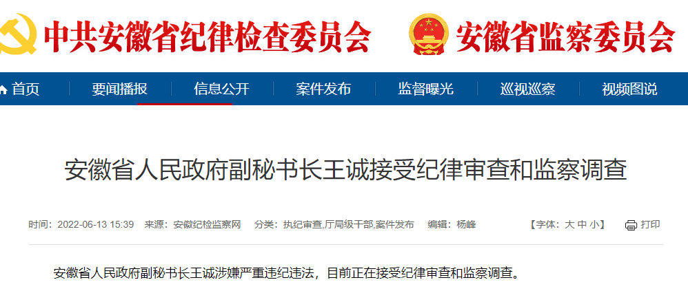此番安徽省紀委監委發布的消息顯示,王誠是在調任安徽省政府副秘書長后被查。