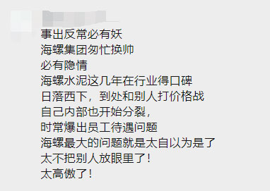 王誠辭職時,就曾有網友表示,“作為世界500強,一般不會如此輕率換帥(接任不足一年),其中必有故事。”也有網友表示:“事出反常必有妖,海螺集團匆忙換帥必有隱情。”另有網友表示,“第一反應,腐敗了”。