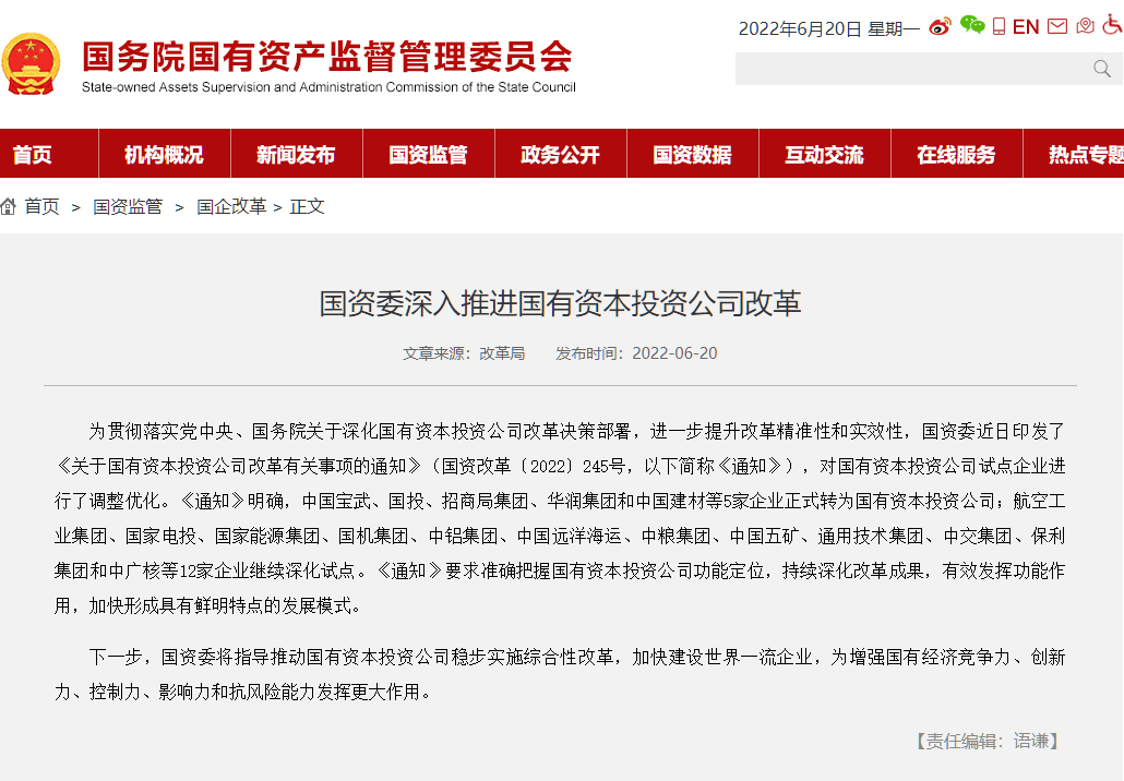 6月20日國資委官網(wǎng)發(fā)布《國資委深入推進國有資本投資公司改革》稱,為貫徹落實黨中央、國務(wù)院關(guān)于深化國有資本投資公司改革決策部署,進一步提升改革精準性和實效性,國資委近日印發(fā)了《關(guān)于國有資本投資公司改革有關(guān)事項的通知》(國資改革〔2022〕245號,以下簡稱《通知》),對國有資本投資公司試點企業(yè)進行了調(diào)整優(yōu)化。