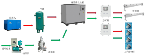 該系統通過空壓機制造壓縮空氣,輸送至儲氣罐,儲氣罐可保持壓縮空氣壓力恒定,將恒定的壓縮空氣輸送至噴霧抑塵主機,水泥廠水管網會有大量循環廢水,不能隨意排放,噴霧抑塵技術可以將其利用,將循環廢水輸送至恒壓泵,加壓后經過過濾雜質,輸送給噴霧抑塵主機,經噴霧抑塵主機調配壓力處理后,將壓縮空氣和水輸送給分配器,分配器再將壓縮空氣和水分別輸送給噴霧箱和萬向節噴頭。特制的雙流體噴頭,利用超聲波產生的微細水霧(10微米左右)捕集凝聚微細粉塵,將粉塵直接抑制在起塵點,避免了揚塵的出現,使粉塵得到有效控制。既能保證揚塵的治理效果,也不會顯著增加產塵物料的濕含量,還能處理掉水泥廠的循環廢水。
