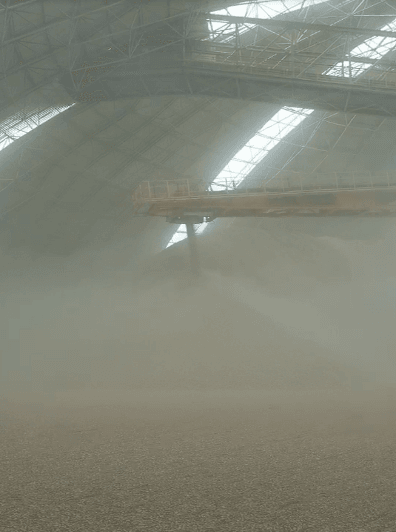 (1)通過噴灑水霧,原材料附近的濕氣將導致水分聚集在粉塵顆粒周圍,從而增加了粉塵顆粒的質量和直徑,這有利于粉塵之間的碰撞。當粉塵顆粒相互碰撞時,由于表面上的水分,回彈力降低,粉塵顆粒逐漸沉降。
