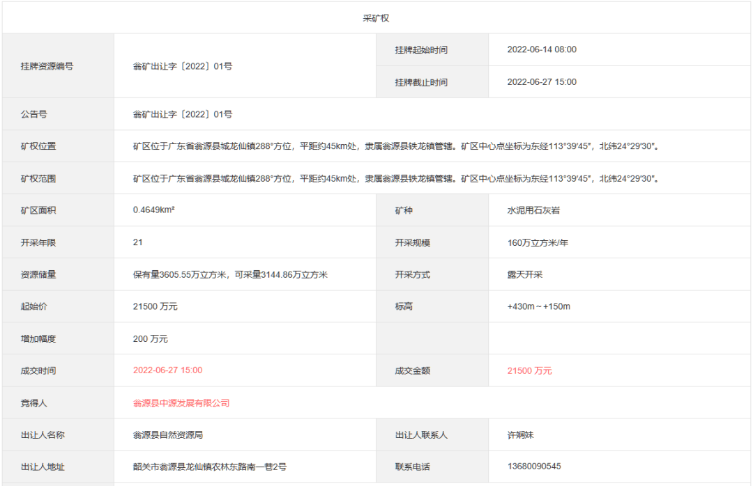 日前,廣東省韶關(guān)市自然資源交易系統(tǒng)發(fā)布,翁源縣中源發(fā)展有限公司以超2億元成功競(jìng)得廣東省翁源縣鐵龍鎮(zhèn)將軍屯北部礦區(qū)水泥用灰?guī)r礦采礦權(quán),該礦區(qū)出讓范圍內(nèi),建筑石料用資源儲(chǔ)量超5000萬(wàn)噸,年生產(chǎn)規(guī)模160萬(wàn)立方米,出讓年限21年。