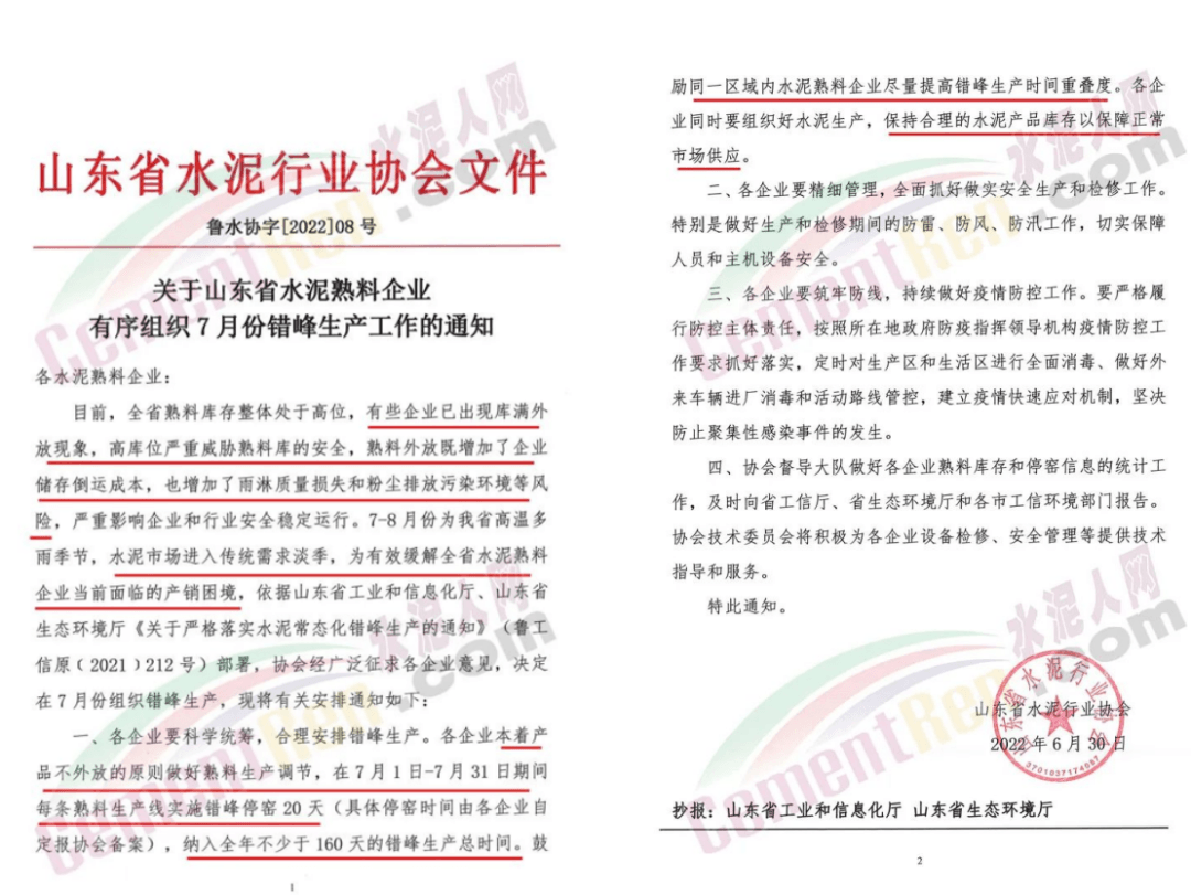 山東省水泥行業協會發布《關于山東省水泥熟料企業有序組織7月份錯峰生產工作的通知》提到,全省熟料庫存整體處于高位,有些企業已出現庫滿外放現象,高庫位嚴重威脅熟料庫的安全,熟料外放既增加了企業儲存倒運成本,也增加了雨淋質量損失和粉塵排放污染環境等風險。通知要求各企業本著產品不外放的原則做好熟料生產調節,在7月1日-31日期間每條熟料生產線實施錯峰停窯20天,納入全年不少于160天的錯峰生產總時間。