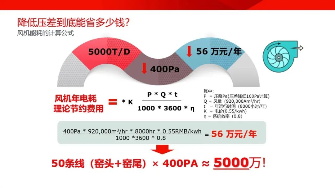以戈?duì)枮V袋5年使用壽命算算,一條日產(chǎn)5000的熟料生產(chǎn)線計(jì)算:一年運(yùn)行8000小時(shí),風(fēng)量920000立方小時(shí),壓降400pa,風(fēng)機(jī)效率80%,電價(jià)0.55元度,年降低費(fèi)用56萬。一家集團(tuán)企業(yè)50條窯線(窯頭、窯尾),可節(jié)約5000萬/年。