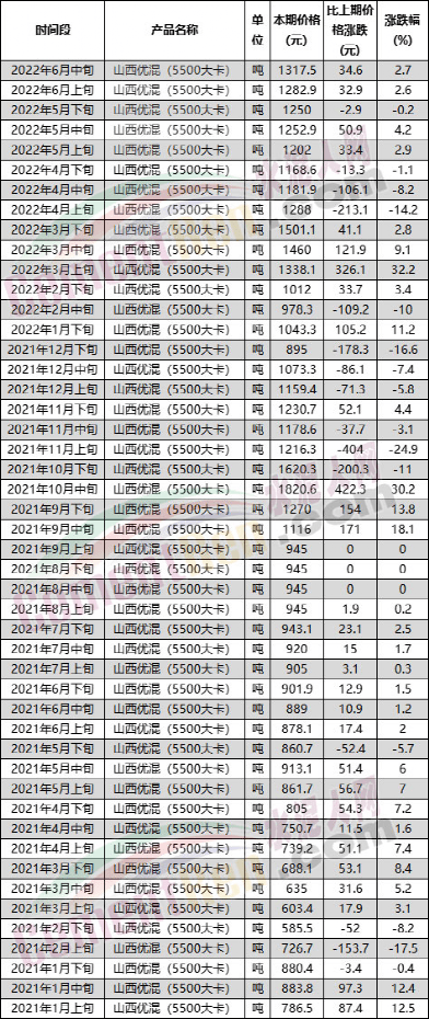國家統計局最新公布的6月中旬流通領域山西優混(5500大卡)煤炭市場價格為市場價格為1317.5元/噸,較上年同期889元/噸,上漲了428.5元/噸,漲幅48%。