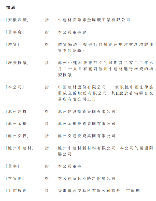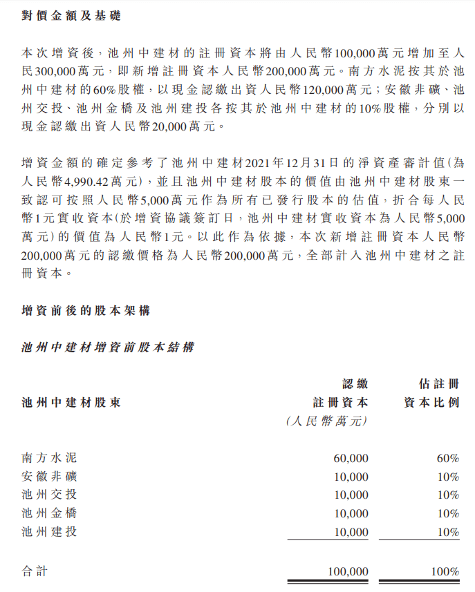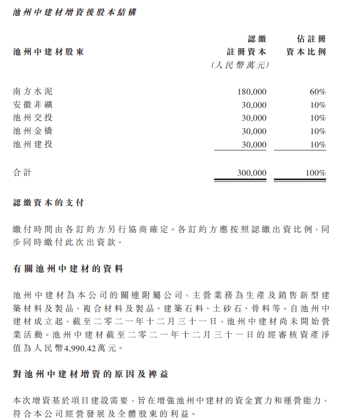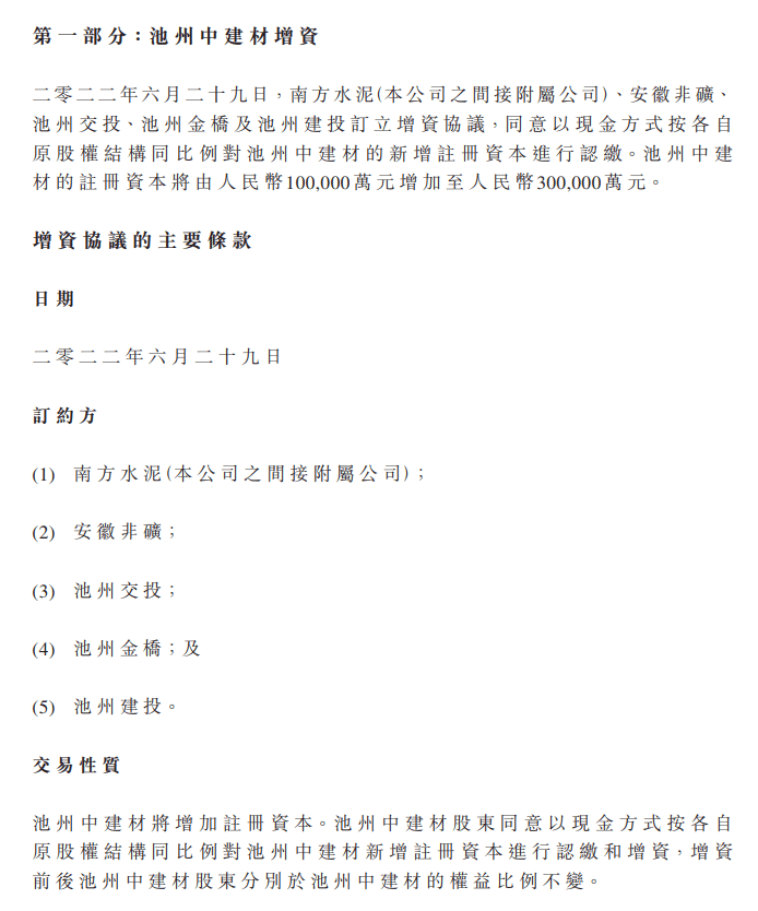 中國建材(03323)公布,于2022年6月29日,南方水泥(該公司的間接附屬公司)、安徽非礦、池州交投、池州金橋及池州建投訂立增資協(xié)議,同意以現(xiàn)金方式按各自原股權(quán)結(jié)構(gòu)同比例對(duì)池州中建材的新增注冊(cè)資本進(jìn)行認(rèn)繳。池州中建材的注冊(cè)資本將由人民幣10億元增加至人民幣30億元,其中南方水泥認(rèn)繳新增注冊(cè)資本人民幣12億元,安徽非礦、池州交投、池州金橋及池州建投各認(rèn)繳人民幣2億元。
