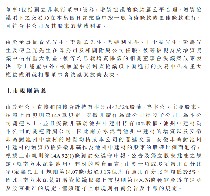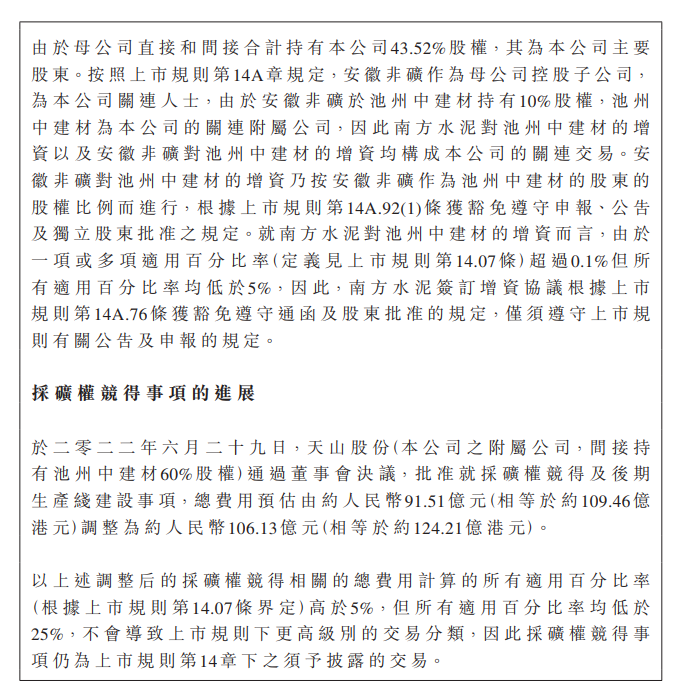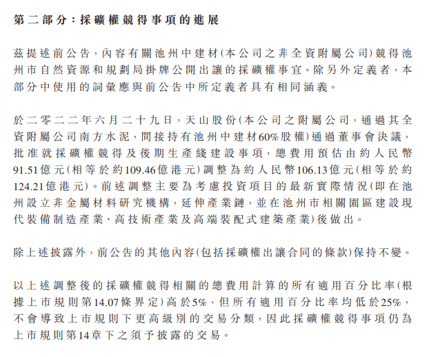 同日,天山股份(該公司的附屬公司,間接持有池州中建材60%股權(quán))通過董事會(huì)決議,批準(zhǔn)就采礦權(quán)競(jìng)得及后期生產(chǎn)線建設(shè)事項(xiàng),總費(fèi)用預(yù)估由約人民幣91.51億元(相等于約109.46億港元)調(diào)整為約人民幣106.13億元(相等于約124.21億港元)。