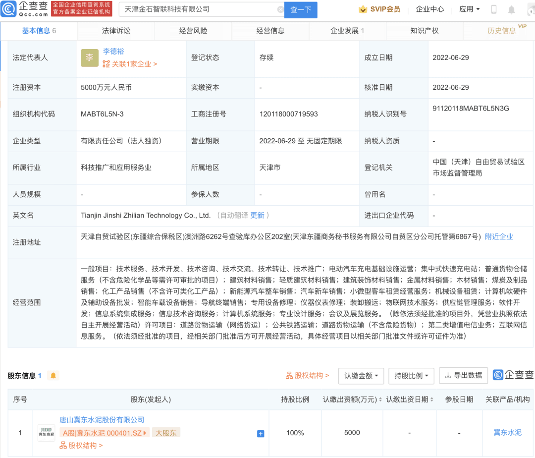 天眼查APP顯示,6月29日,天津金石智聯(lián)科技有限公司成立,法定代表人為李德裕,注冊資本5000萬元,經(jīng)營范圍包含:電動(dòng)汽車充電基礎(chǔ)設(shè)施運(yùn)營;集中式快速充電站;新能源汽車整車銷售;汽車新車銷售;小微型客車租賃經(jīng)營服務(wù)等。企查查股權(quán)穿透顯示,該公司由冀東水泥100%控股。