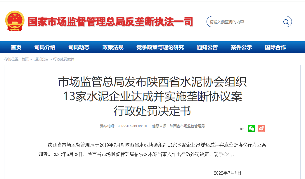 日前,國家市場監管總局發布陜西省水泥協會組織13家水泥企業達成并實施壟斷協議案行政處罰決定書稱,陜西省市場監督管理局于2019年7月對陜西省水泥協會組織13家水泥企業涉嫌達成并實施壟斷協議行為立案調查。2022年6月28日,陜西省市場監督管理局依法對本案當事人作出行政處罰決定?,F予公告。