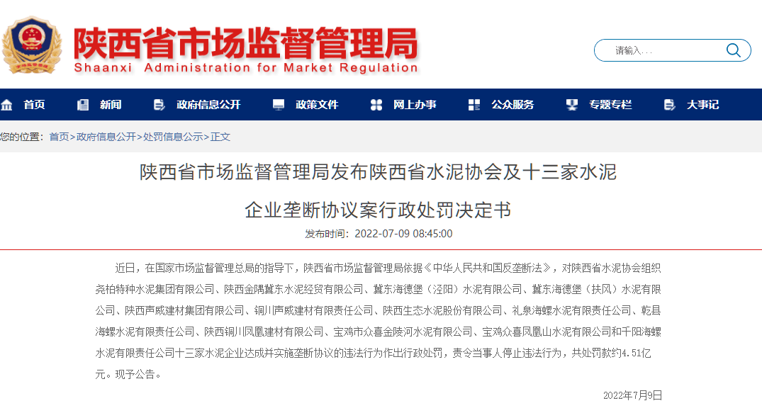 陜西省市場監督管理局發布《陜西省水泥協會及十三家水泥企業壟斷協議案行政處罰決定書》稱,近日,在國家市場監督管理總局的指導下,陜西省市場監督管理局依據《中華人民共和國反壟斷法》,對十三家水泥企業達成并實施壟斷協議的違法行為作出行政處罰,責令當事人停止違法行為,共處罰款約4.51億元。
