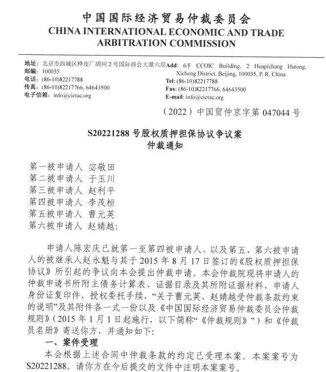 蓋有貿仲會藍色印章的仲裁通知顯示,6月23日,貿仲會確認收到陳宏慶對宓敬田、于玉川等六人提起仲裁的相關文件以及仲裁預付金。