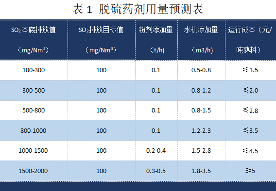 基于現(xiàn)場(chǎng)實(shí)際情況,多方面因素考慮,最終采用高效復(fù)合脫硫系統(tǒng)。該方案具有效果顯著、自動(dòng)化控制,計(jì)量精確等優(yōu)點(diǎn)。同時(shí),考慮后期排堿需要,可以自行定期外排高硫高堿窯灰。