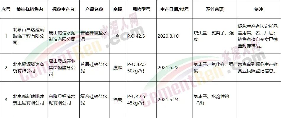 北京市水泥產(chǎn)品質(zhì)量監(jiān)督抽查不合格產(chǎn)品匯總表