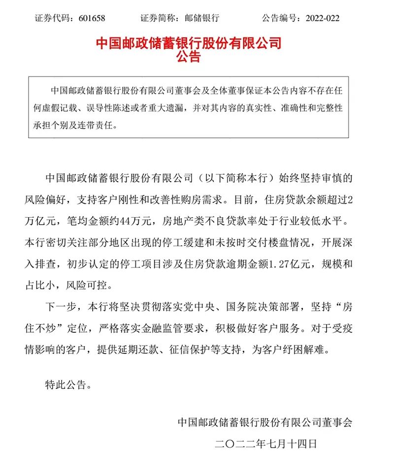 郵儲銀行公告稱,該行始終堅持審慎的風險偏好,支持客戶剛性和改善性購房需求。目前,住房貸款余額超過2萬億元,筆均金額約44萬元,房地產類不良貸款率處于行業較低水平。該行密切關注部分地區出現的停工緩建和未按時交付樓盤情況,開展深入排查,初步認定的停工項目涉及住房貸款逾期金額1.27億元,規模和占比小,風險可控。