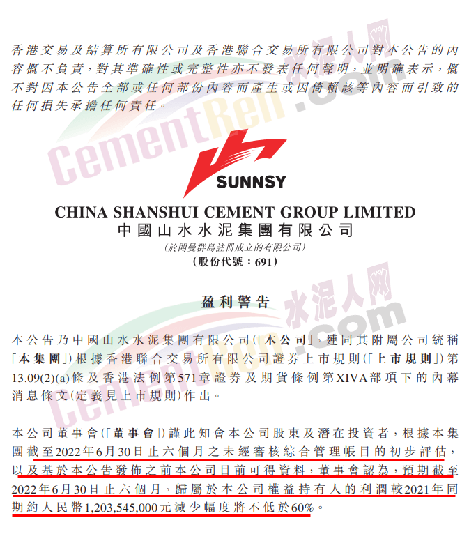 山水水泥7月17日公告,根據集團截至2022年6月30日止六個月之未經審核綜合管理帳目的初步評估,以及基于公告發布之前公司目前可得資料,董事會認為,預期截至2022年6月30日止六個月,歸屬于公司權益持有人的利潤較2021年同期約12.04億元減少幅度將不低于60%。