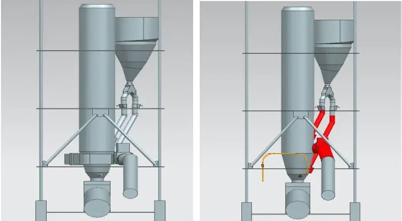 1)三次風(fēng)管雙進(jìn)風(fēng)系統(tǒng)阻力大、能耗高,分支管道因彎頭及長度造成阻力不均勻,不易調(diào)節(jié)三次風(fēng)閥進(jìn)行控制,很難確保分支管道入爐場氣流的均衡穩(wěn)定,導(dǎo)致爐場氣流與物煤料混合絮亂,對分解爐錐部煙室的風(fēng)阻和氣料干擾大;雙進(jìn)風(fēng)設(shè)計彎頭角度大,易造成管道積料和磨損,日常檢修、維護(hù)成本高。
