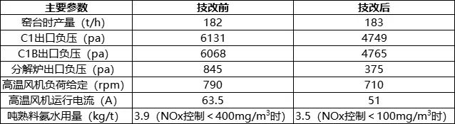 2021年11月,河南匯金智能裝備有限公司對甘肅某熟料生產(chǎn)線天津院設(shè)計的5000噸生產(chǎn)線和寧夏某熟料生產(chǎn)線南京院設(shè)計的2500噸生產(chǎn)線進(jìn)行了煙氣脫硝系統(tǒng)改造和三次風(fēng)管降阻系統(tǒng)優(yōu)化改造。改造后效果較為明顯,三次風(fēng)管降阻系統(tǒng)優(yōu)化和煙氣脫硝系統(tǒng)改造后氮氧化物控制在320mg/m3以內(nèi)時,噸熟料氨水用量1kg以內(nèi);也可實現(xiàn)氮氧化物可以控制在100mg/m3以內(nèi),噸熟料氨水用量3.5kg左右,同時C1出口系統(tǒng)壓力明顯下降(見表1、表2)。