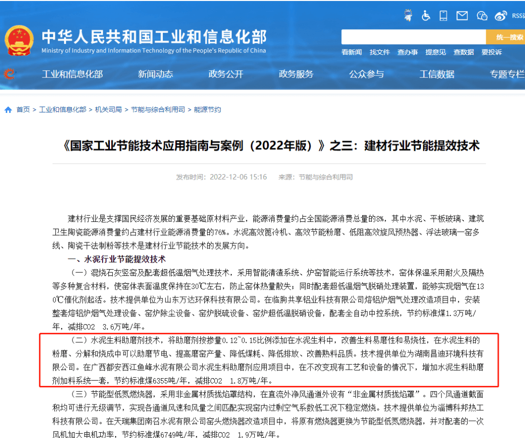 為加快推廣應用先進適用節(jié)能技術(shù)裝備,促進企業(yè)節(jié)能降碳、降本增效,工信部近日發(fā)布了《國家工業(yè)和信息化領(lǐng)域節(jié)能技術(shù)裝備推薦目錄(2022年版)》,湖南昌迪環(huán)境科技有限公司(以下簡稱“湖南昌迪”)申報的水泥生料助磨劑應用技術(shù)納入建材行業(yè)節(jié)能提效技術(shù)裝備推薦。