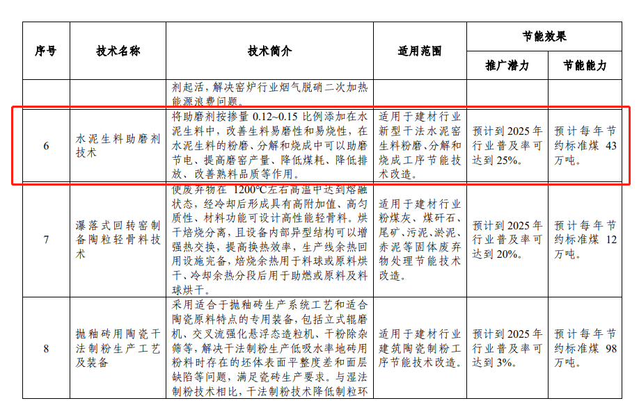 湖南昌迪此次申報的水泥生料助磨劑技術(shù)原理是改善生料易磨性和易燒性,在水泥生料粉磨、分解和燒成中可以助磨節(jié)電、提高磨窯質(zhì)量、降低排放、改善熟料品質(zhì)等作用。該技術(shù)適用于建材行業(yè)新型干法水泥窯生料粉磨、分解和燒成工序的節(jié)能技術(shù)改造。節(jié)能效果預計到2025年行業(yè)普及率可達25%,每年節(jié)約標準煤43萬噸。