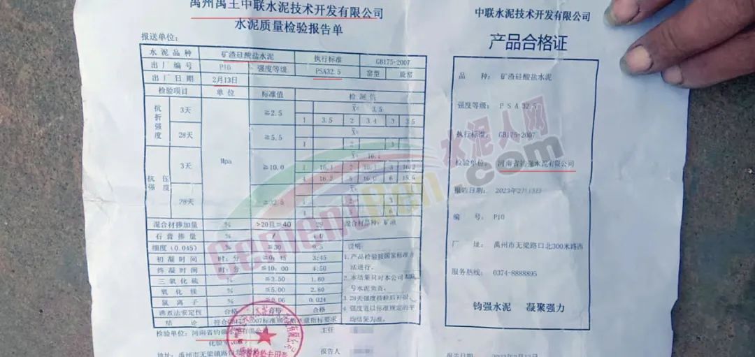 “禹州禹王中聯水泥技術開發有限公司水泥質量檢驗報告單”顯示,水泥品種為礦渣硅酸鹽水泥、執行標準GB175-2007、出廠編號P10、強度等級為 PSA32.5、出廠日期為2月13日。