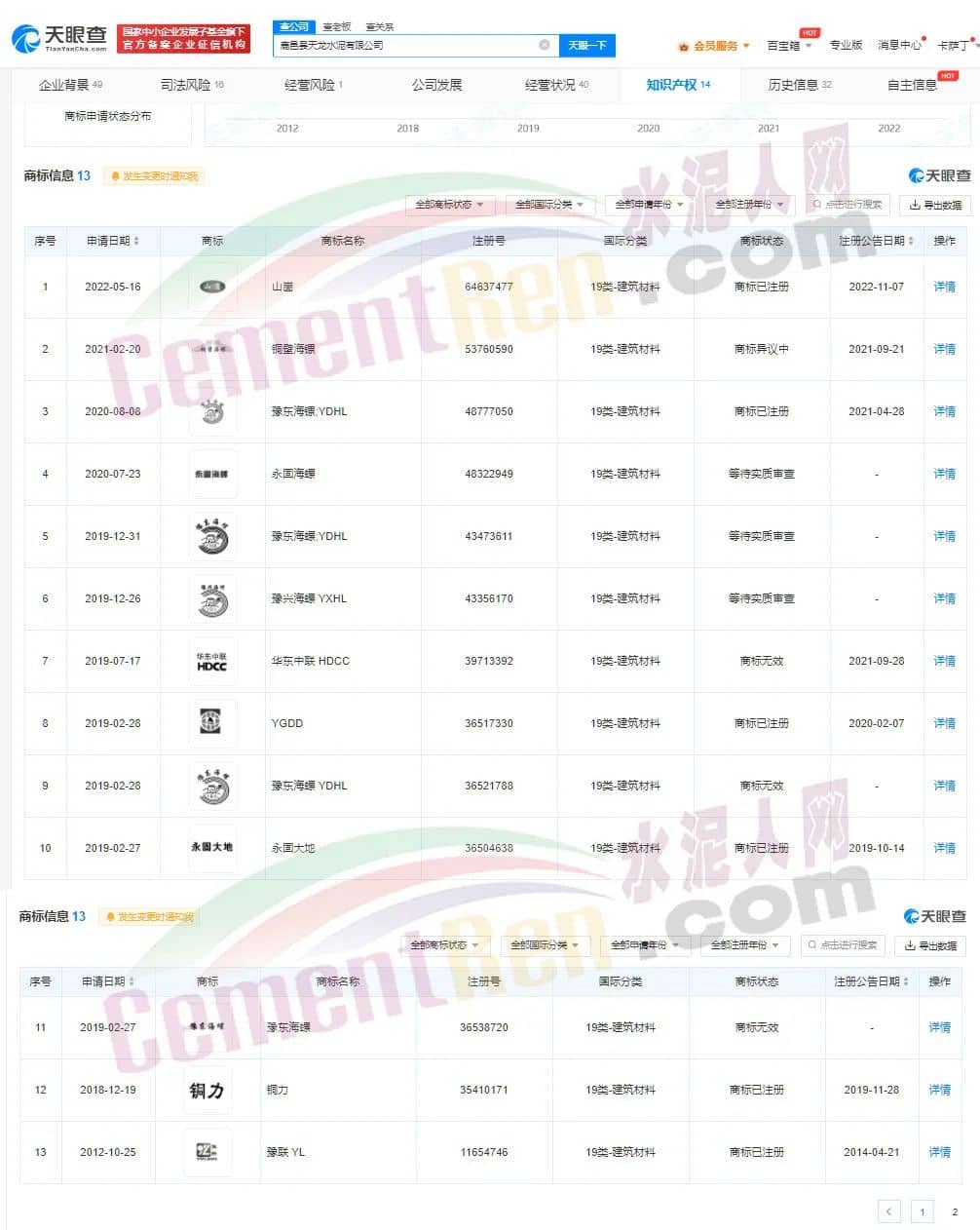 水泥人網注意到,鹿邑縣天龍水泥有限公司旗下共有13條注冊商標信息,其中“豫東海螺”相關兩條為無效商標,一條為等待實質審查階段。另有一條為“豫東海鏍”信息已注冊。
