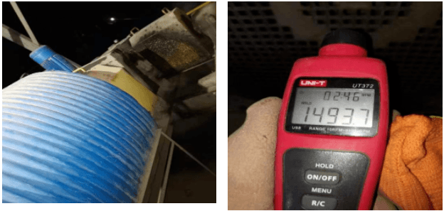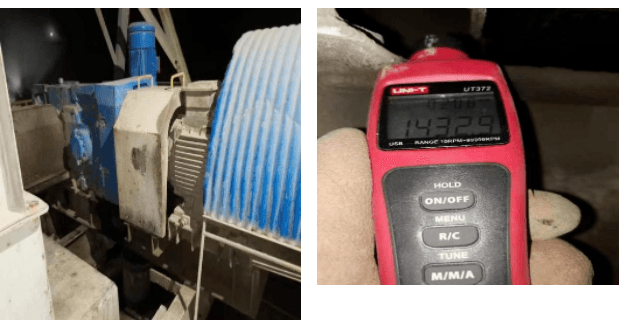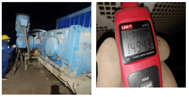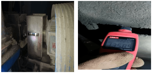 2.設備運行后,使用激光測速儀照射反光貼紙,分別測試并記錄各設備主、從動軸運行轉速。