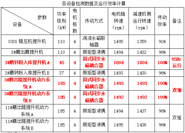 2、測量時間為水泥生產淡季,工況為間歇式運行,載荷較低,甚至部分工況部分時間為空載運行,實際載荷對液偶運行轉速影響較明顯,故測得目前液偶輸出轉速均較高,滿料運行后液偶輸出轉速將會有所降低,傳動效率將處于95%左右。