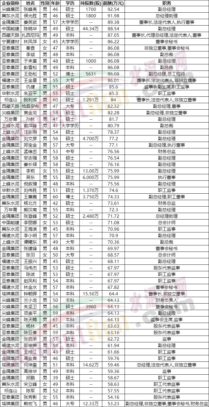 反觀水泥行業,已公布薪酬的252位高管中,年薪超過500萬的高管為零,年薪超過200萬的僅13位。其中年薪最高的是天山股份副董事長肖家祥,薪酬為385.7萬元;第二位是華新水泥李葉青薪酬為359.5萬元,同時持華新水泥股票81.59萬股。按照4月28日華新水泥最新股價14.75元計算,81.59萬股相當于1200多萬元。按此計算拿錢最多的還是華新水泥總裁李葉青。