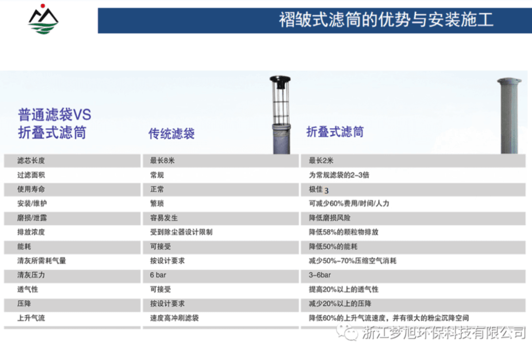 經多家水泥企業使用證明,與傳統的普通濾袋相比,夢旭環保的褶皺式濾筒具有以下優勢: