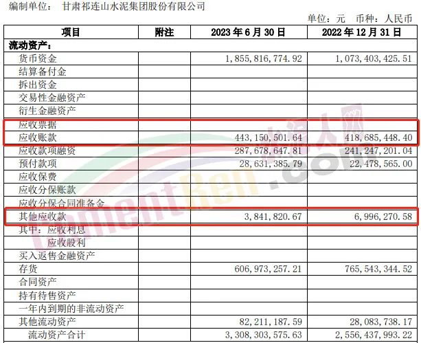 2023年上半年祁連山應收賬款4.43億,其他應收款384.2萬。