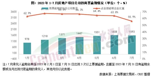 水泥企業(yè)這些票據(jù)賬款中有多少是房地產企業(yè)的,我們無從得知,但是看看房地產行業(yè)的情況就能發(fā)現(xiàn),情況不容樂觀。據(jù)票交所公布的《截至2023年7月31日承兌人逾期名單》,2023年2月末到7月末發(fā)生3次以上商票逾期,且月末有逾期余額或當月出現(xiàn)票據(jù)逾期行為的房地產項目公司數(shù)量1593個,占全部商票逾期企業(yè)的比重為55.9%。