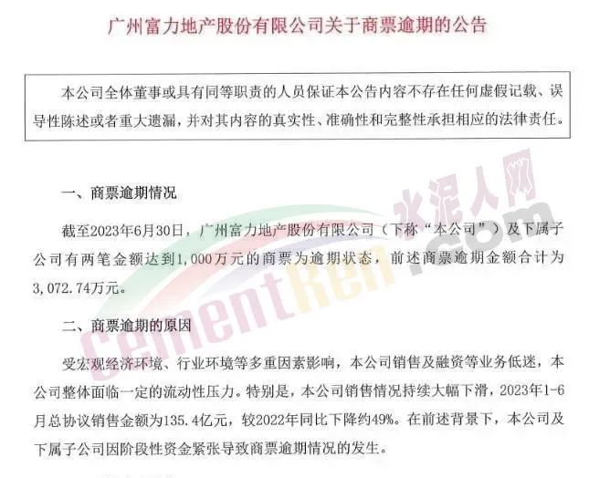 截至6月30日,廣州富力及下屬子公司有兩筆金額達到1000萬元的商票為逾期狀態(tài),前述商票逾期金額合計為3072.74萬元。此前,富力地產由于商票逾期,被債權人廣東祥正商貿有限公司、廣州市廣豐混凝土有限公司以“不能清償?shù)狡趥鶆涨颐黠@缺乏清償能力”申請破產重整。