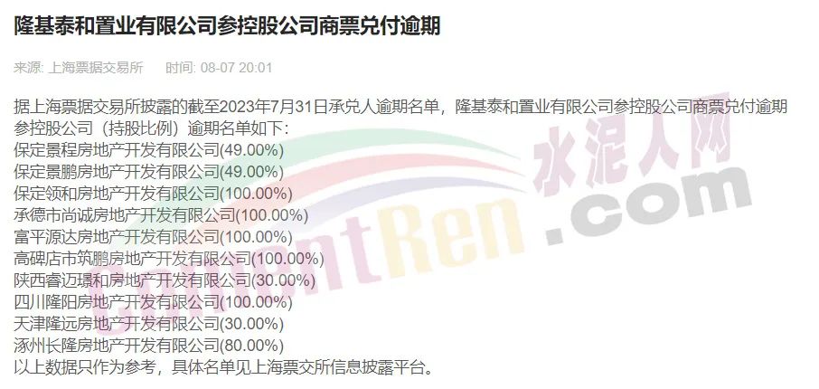 隆基泰和債務爆雷始于2021年底,旗下隆基泰和置業(yè)出現(xiàn)商票逾期,有10多筆商票拒付。直至今日,隆基泰和置業(yè)仍在上海票交所公布的“持續(xù)逾期名單”中。截至2023年6月30日,隆基泰和置業(yè)有限公司商票逾期5373.35萬元,累計逾期發(fā)生額6300.44萬元。