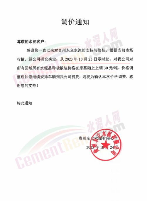 金隅冀東經(jīng)貿(mào)公司通知,由于近期原材料持續(xù)上漲,生產(chǎn)能耗成本增加,導(dǎo)致公司生產(chǎn)成本增加。為維持企業(yè)正常生產(chǎn)經(jīng)營(yíng),保障項(xiàng)目水泥供應(yīng),經(jīng)研究決定自2023年10月23日8時(shí)起,將米脂冀東水泥有限公司、山西金隅冀東環(huán)??萍加邢薰景l(fā)往榆林市、延安市所有市場(chǎng)各品種水泥出廠價(jià)上調(diào)30元/噸。