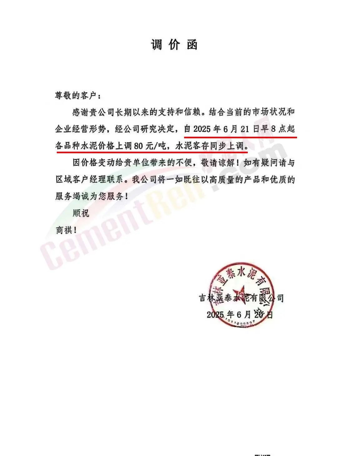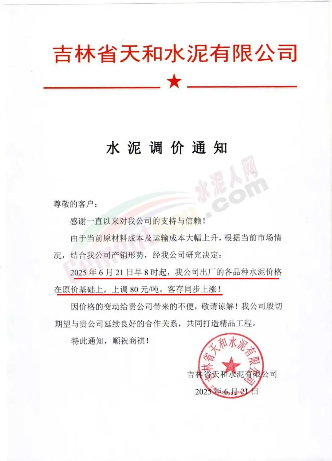 吉林天和水泥通知,自6月21日起,公司出廠的各品種水泥價格在原價基礎(chǔ)上上調(diào)80元/噸,客存同步上漲。